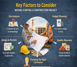 Starting a construction project requires careful planning, budgeting, and choosing the right contractor. Factors such as site analysis, structural design, material quality, and legal approvals play a critical role in ensuring a successful project. Proper planning helps avoid delays, reduces costs, and ensures long-term durability.